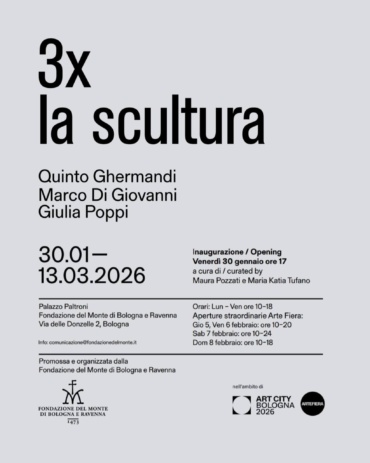 Fino 13 marzo 2026, Fondazione del Monte di Bologna e Ravenna presenta a Palazzo Paltroni la mostra 3 x la scultura: tre modi di “fare scultura” in un unico spazio. Quinto Ghermandi, Marco Di Giovanni, Giulia Poppi, a cura di Maura Pozzati e Maria Katia…