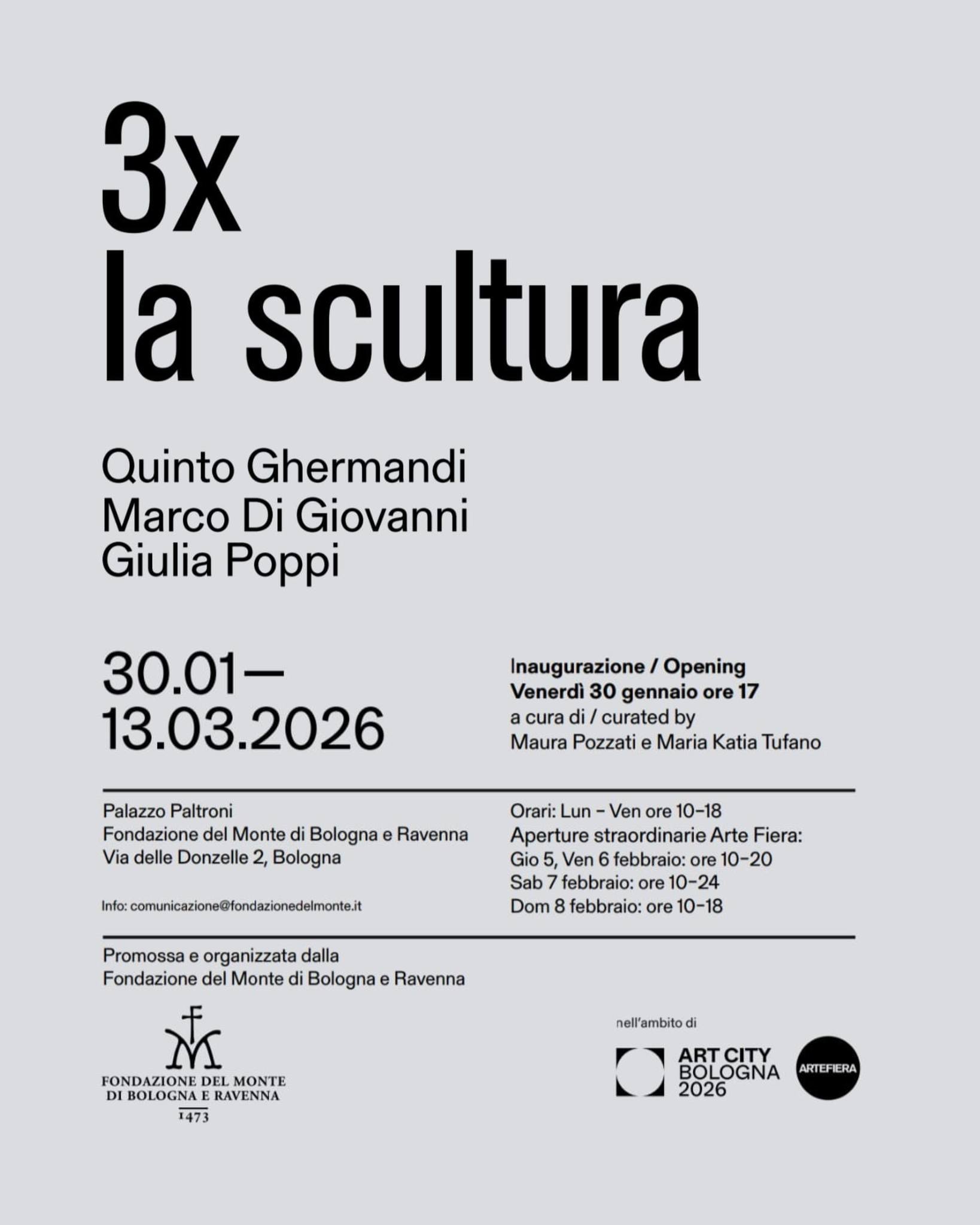 Fino 13 marzo 2026, Fondazione del Monte di Bologna e Ravenna presenta a Palazzo Paltroni la mostra 3 x la scultura: tre modi di “fare scultura” in un unico spazio.